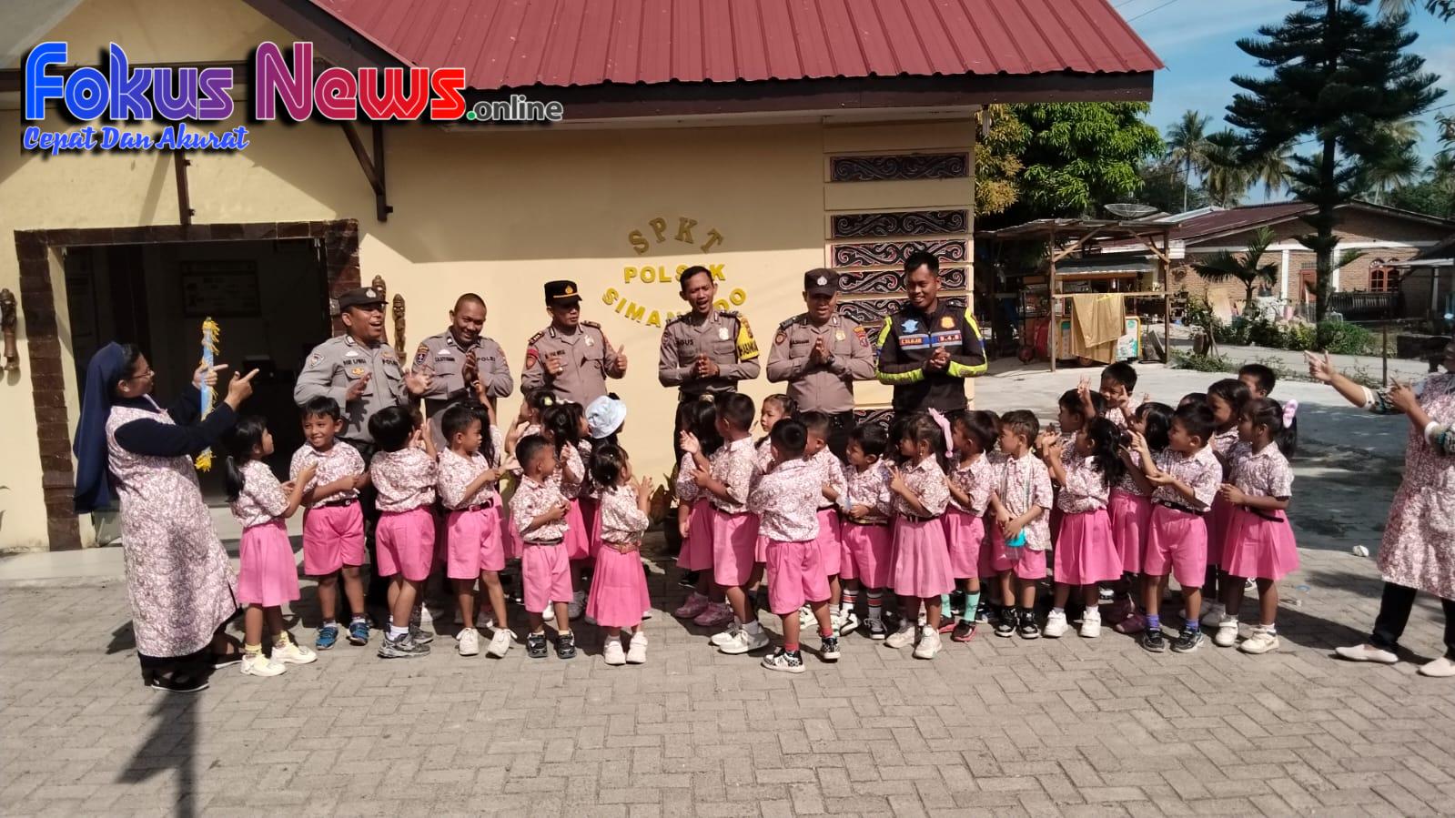 Samosir-Suasana keceriaan terpancar di Mako Polsek Simanindo saat Kapolsek Simanindo AKP Nandi Butarbutar S.H bersama anggotanya menerima kunjungan dari Sahabat Anak-anak TK ASSISI Tomok. (28/02/2024)