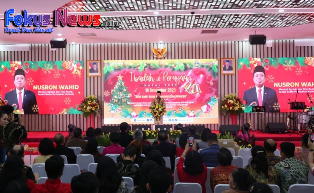 Jakarta – Menteri Agraria dan Tata Ruang/Kepala Badan Pertanahan Nasional (ATR/BPN), Nusron Wahid, membuka kegiatan Ibadah dan Perayaan Natal Keluarga Besar Persekutuan Umat Kristiani Kementerian ATR/BPN, yang digelar di Aula Prona Kementerian ATR/BPN, Jakarta, Jumat (19/12/2025). Dalam sambutannya, Menteri Nusron menegaskan pentingnya menjadikan esensi ajaran agama sebagai landasan utama dalam bekerja dan melayani masyarakat.