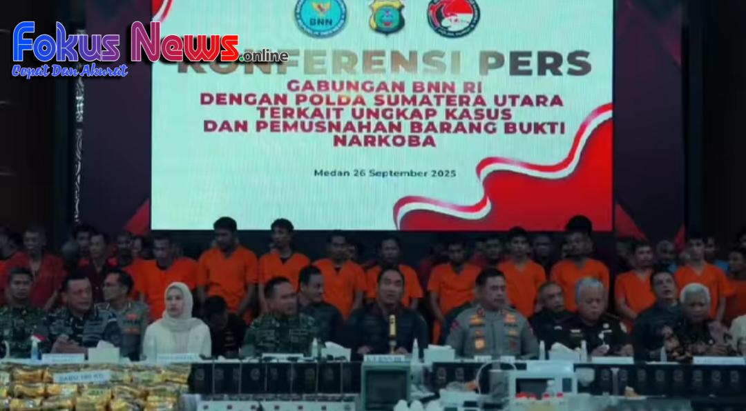 MEDAN – Dalam rangkaian konferensi pers gabungan bersama BNN RI, Kepolisian Daerah Sumatera Utara (Polda Sumut) melakukan pemusnahan barang bukti narkotika hasil pengungkapan kasus sepanjang 30 Juni hingga 25 September 2025, atau selama 88 hari operasi.